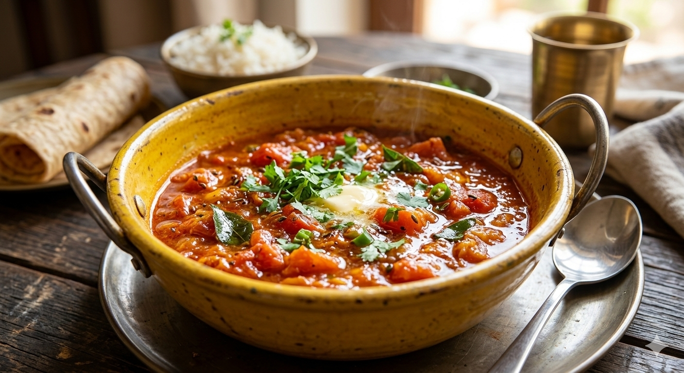 This Tomato Subzi is a vibrant, quick-cooking dish that celebrates the bold acidity and sweetness of vine-ripened tomatoes. It’s a "pantry staple" hero—perfect for those days when the vegetable basket is empty but you crave a hot, flavorful meal. A generous amount of firm, red tomatoes is sautéed until they break down into a luscious, jammy consistency. A savory tempering of mustard seeds, cumin, and hing (asafoetida) provides an earthy foundation, while a touch of jaggery or sugar balances the natural tartness. While it’s a classic companion to soft phulkas or parathas, it also doubles as a zesty accompaniment to simple Dal-Chawal.