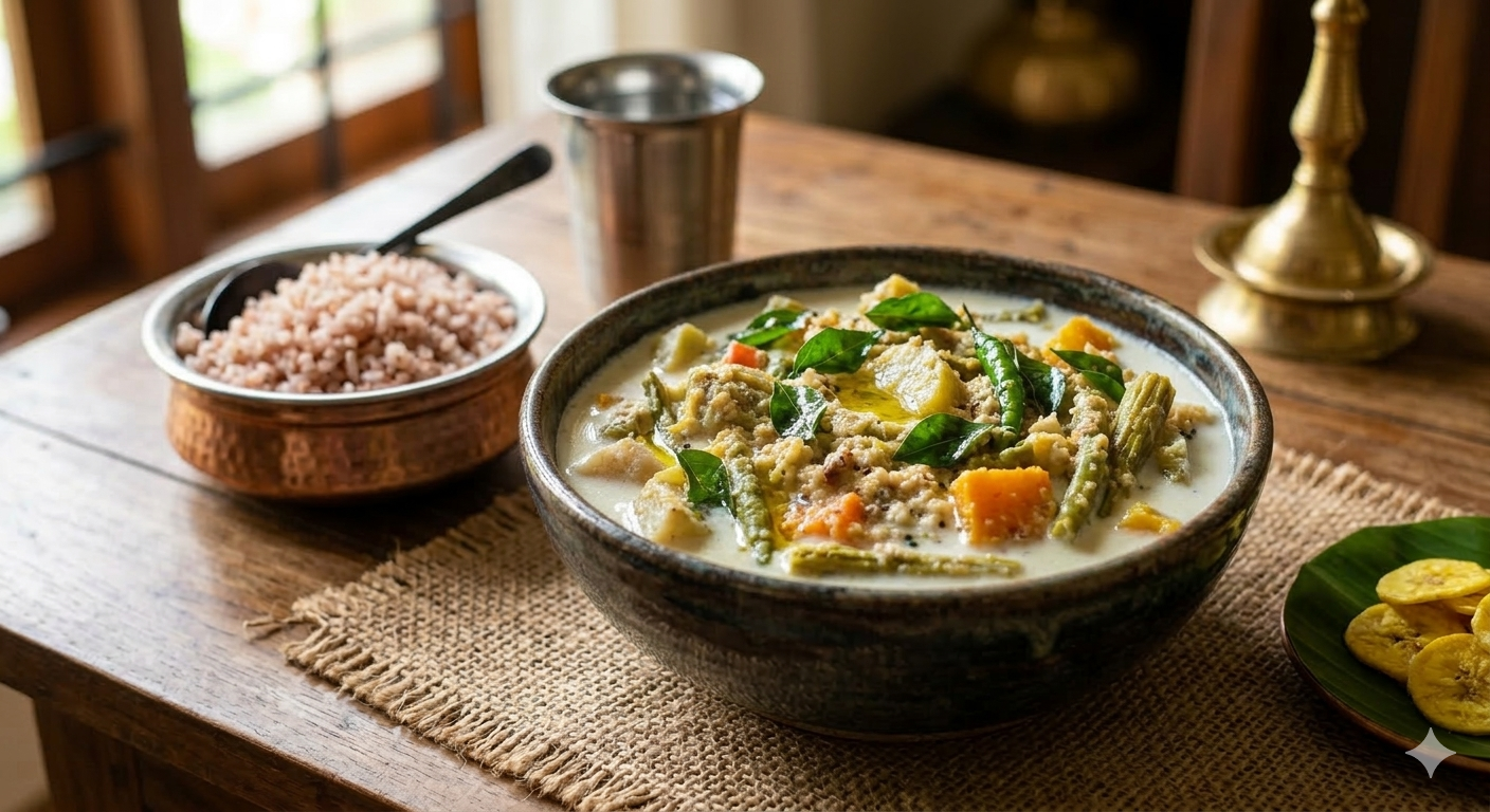 Avial is a vibrant, coconut-based medley that stands out as the crown jewel of Keralam's traditional sadya. Celebrate the bounty of seasonal vegetables with this authentic cornerstone of traditional South Indian feasts. Gently simmered in a creamy coconut and curd base, then infused with the distinct aroma of raw coconut oil and fresh curry leaves, Avial offers a mild yet complex flavor profile. It is a wholesome, coconut-rich classic that perfectly balances texture and tradition.
